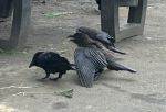 A recently fledged juv Raven was sheltering in some bushes in a tiny garden between KGV & Stamford Park; an adult was perched on a low tree fending off Crows and Magpies and doing back flips at roof height. Never in my wildest dreams, etc etc.