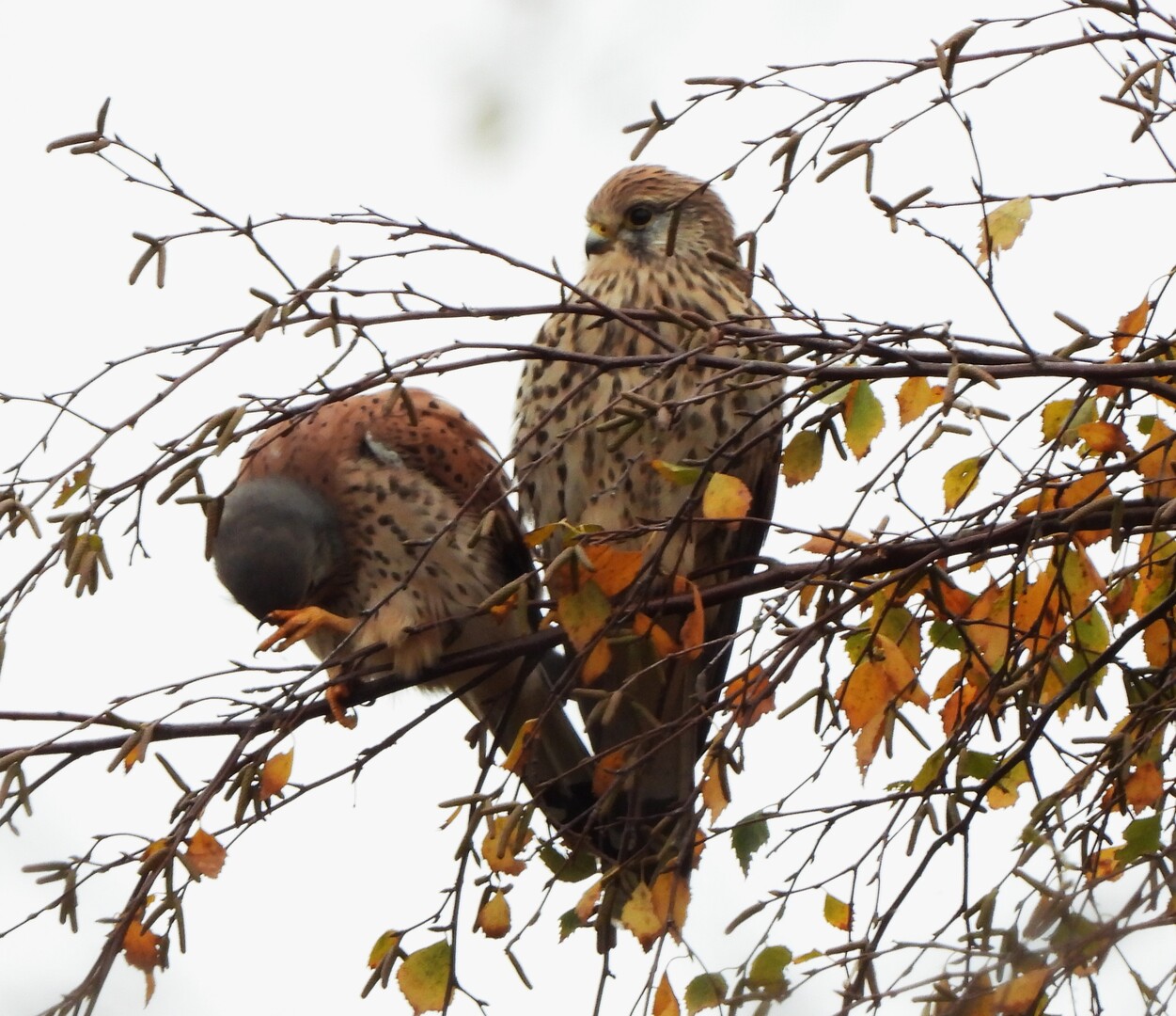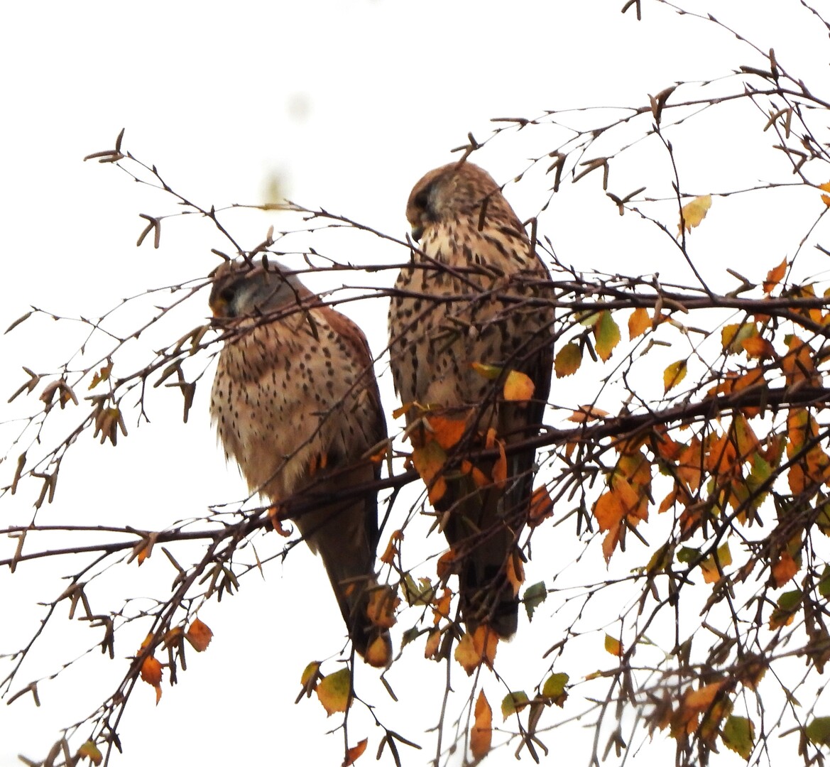 Pair Kestrel sat side by side in a birch...domestic bliss!