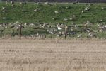 Initially no sign but I headed east along Plex Moss Lane and found a huge flock of Pink-footed Geese in flight, a quick scan with bins allowed me to pick out the Snow Goose pretty easily. There was a big Pheasant shoot going on and I reckon that this was making the geese pretty restless. I did a U-turn and headed back west following the flock. They came down in a sheep field by Plex Moss Lane and started to feed on the grass giving me the chance to grab several digiscoped images, two of which are attached, the first uncropped and the second cropped down to a panoramic format.
