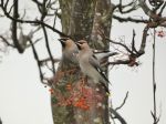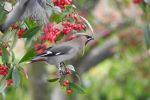 12 Waxwing still 09.35 coming to Cotoneaster at the end of Capenhurst Close, Wythenshawe. Right leg colour ring combinations noted : blue over red & yellow over blue