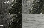 Also made the journey from Cheshire to Bempton RSPB today, arriving about 25-45mins after Mark. Horrendous hold up in Stamford Bridge where a lorry had hit the bridge and blocked the A166 both ways. After diverting I arrived later than planned but the Black-browed Albatross was on the cliffs and took off just as I arrived. Excellent views through bins as it flew directly towards me and right under the cliff directly in front of me. I had great scope views of it on the water quite close in before it headed off to it's cliff roost again. I moved along the coast to the nearest point that it could be seen. Zooming uo to c.50x the views were really nice, all features being seen clearly. But as Mark says too far for proper photographs. It was murky, drizzly too after leaving Cheshire in a T-shirt and bright, warm sunshine! A montage of digiscoped cropped record-only pics attached.