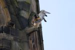 Both resident birds briefly on the Twon Hall Tower before calling and flying together around the Town Hall. They then both left the area and headed in different directions.