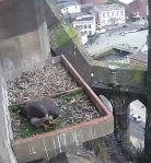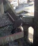 9.00am Peregrine at top of spire on Town Hall (not a usual perch) for local peregrines. 9.45am Peregrine perched at same level as nest tray but on opposite side of building. I do not know if it was the same bird a at 9.00am.