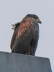 Hi Andy, its a Harriss Hawk, or at least judging by the single image it certainly appears to be one. The fairly large looking yellow bill, and the black and white tail pattern look to be that of a Harriss Hawk that is native to The Americas.