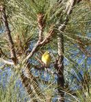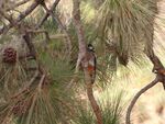 It's odd enough seeing these birds in pine forests let along hanging upsidedown on a pine cone.